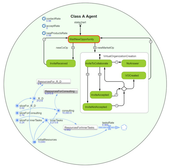 The organisations figure in the PAAM as agents, using ABM to model their collaboration behaviour in the CBE. Figure 5 shows a zoom-in of a Class A agent. A statechart controls the agent’s state from WaitNewOpportunity to the state InviteToCollaborate when a new market opportunity is received. Then, the agent transits to a new state where he can decide (based on his profile) to invite another organisation to collaborate, creating a CoOp and forming a virtual organization with partners. On the other hand, when the recipient agent receives a new CoOp, he transits to the state InviteReceived and can or can not accept the collaboration based on his profile and available resources. Stocks from system dynamics (SD) manage the agents’ resources, and distribution functions [60] simulate the agents’ decision to invite or accept CoOps, resulting in Formulas (1)–(3). The organisation’s profile (contact rate, accept rate and new products rate) parameterizes a Bernoulli distribution, meaning that a higher parameter value results in a higher probability of having positive outcomes. Formula (4) uses a Triangular distribution to simulate the number of business units given to the other organisations resulting from the collaboration.