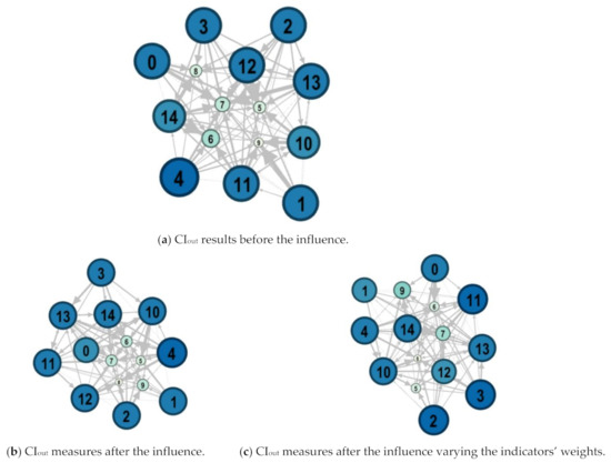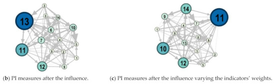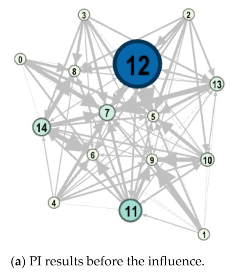 The presented experiment analyses the CIout and PI outcomes in three variants of the considered scenario: (a) measures without the influence of the performance indicators; (b) measures with a factor of influence FI = 0.4 and with performance indicators’ weights of wCI = 2, wPI = 1, and wII = 1; and (c) measures with the same factor of influence but varying the perform indicators’ weights to wCI = 4, wPI = 1, and wII = 1. The results are shown in a tabular and graphical representation using the Gephi tool [61].