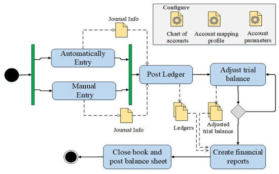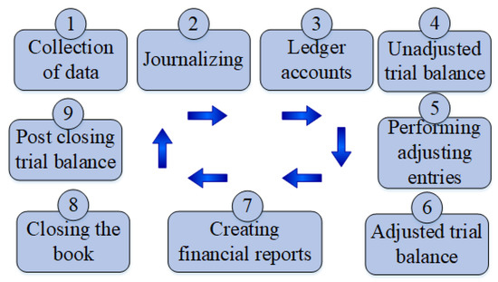 An accounting system is the system that manages the organization’s financial information. This paper focuses on the computerized accounting system or the accounting information system (AIS) [16]. The cycle of the accounting system is shown in Figure 1. The accounting process starts at the journal entry module, which is an accounting treatment operated accordingly to the principle of double-entry accounting [17]. A chart of accounts [16] is a list of financial accounts that is set up for mapping the raw financial data or business transaction into the accounting transactions. A ledger contains a list of accounting transactions derived from the journal entries. A ledger posting is a transforming process the Debit and Credit amounts in the journals into the corresponding ledger account. Next, the accountants may adjust the account at the end of account period, and the financial report creation and the book closing or ledger closing are performed, respectively. Essentially, AIS provides the seven core modules as follows: