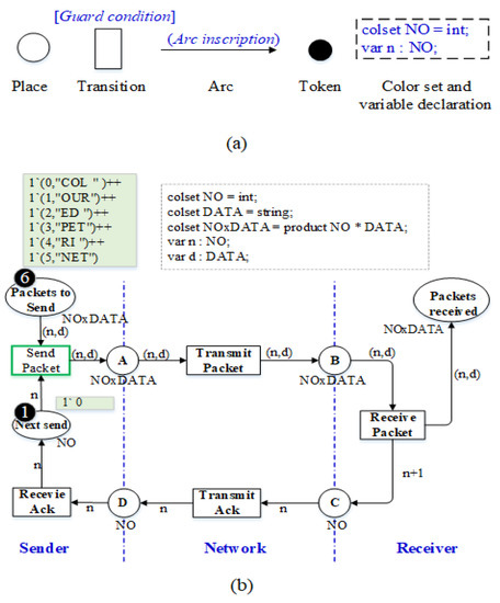 (a) Core elements of CPN. (b) Example of CPN model of a simple protocol.