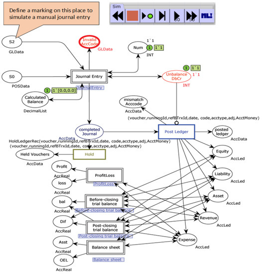 Considered the CPN model in Figure 6a, the learners can simulate the automatic journal entry by determining the token color in place “S0”. In actual, this place connects to the output place of the POS module. The determined token color in this place represents the raw data that are received from the POS module. In the simulation process, the transition “AutomateByPOS_System” consumes the tokens in place “S0”. The tokens will pass the arc inscription with the CPN function named “POSSim”. The token colors are passed by a list of the variables: barcode, amount, price, and discount. Next, the tokens containing the output data will pass the transition “MapTransToJournal” and call the function “AccMap” in order to map the raw data into the accounting transactions. These processes are the activities sequence and data flows of a journal entry process that the learners should be comprehended.