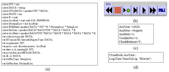 Inscriptions of the CPN model: (a) Excerpt Color sets, variables and functions of the model, (b) Simulation pallet, (c) Accounting parameters, (d) CPN inscriptions that are implemented as a function for closing the book and exporting the simulation log. The chart of account is declared as a string ArrayList data type and the account mapping profile is declared as the CPN functions in a part of (a).