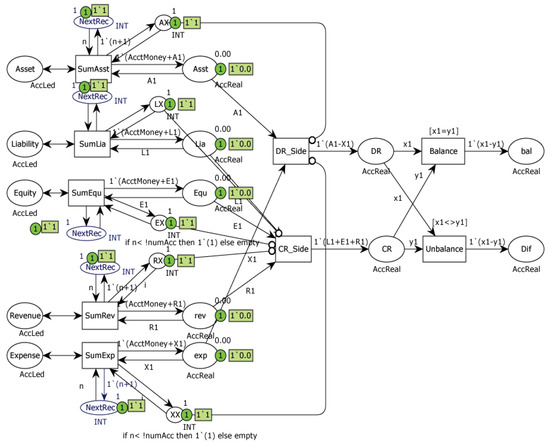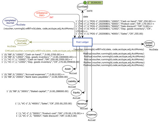 To demonstrate the validation process of accounting transaction system, the accounting transactions that come from the manual journal entry and automatic journal entry will be re-checked by the transition “CheckAccCode” to verify whether the account code of each transaction is valid or not. If the account code exists in a chart of accounts, the token will appear in the place “Valid”. In contrast, the mismatched account code will be removed, and the token will appear in place “Invalid AccCode”. In the case of a valid transaction, the transition “complete the journal” consumes the valid accounting transaction. The transition consumes the tokens accordingly to the sequence number (running number). Next, the net balance calculation and the voucher number determination are performed. The net balance is calculated, and the accounting transactions are flagged to be “completed” simultaneously. In the place “completed journal”, the accounting transactions in each voucher can be posted into the ledgers if and only if the net balance of voucher is equal. The net balance checking function (CalculateBal on the output arc of transition “complete the journal”) is implemented for checking the total balance of Dr and Cr of each voucher. The learners can disable the net balance checking function by changing the configuration parameter named “CheckBalance” in the Config-Net to be “0” (see Figure 5c). The formula used for checking the equivalence of the net balance of each voucher is expressed as Equation (1).