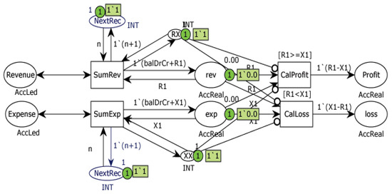 PL is the profit or loss report, and r is the account period. The is the total balance of the ledger i under the core account Revenue. Furthermore, the is the total balance of the ledger under the core account Expense. In the case of a detailed report showing a list of accounts, the list of accounts under the core account Revenue and Expense are retrieved by using the function fList() declared in the Definition 2. Figure 8 shows the CPN construct of the profit or loss report.