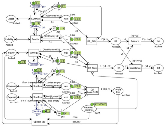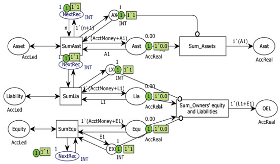 The balance sheet report presents the organization’s assets, liabilities, and equities. The net balances are calculated by using the parameters in Equations (8)–(10). The balance sheet report contains the net balances of the account Asset and the summation of the liabilities including the shareholders’ equities. If the accounting transactions are journalized and posted correctly, the net balances of Asset and LiaEqu will be equal. Figure 11 shows the CPN construct of the balance sheet report.