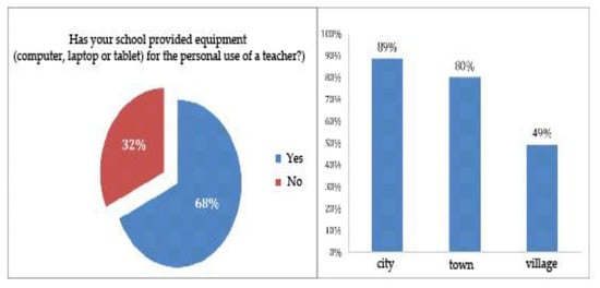 One of the main topics of this survey was access to equipment. The availability of electronic devices is essential for the effectiveness of distance learning because it provides an opportunity for interaction between teachers and students, and between students themselves. Individual access to equipment was measured through questionnaires for students and teachers. In 86% of schools, all teachers have a computer, laptop, or tablet in their home. In the remaining 14% of schools, between 1% and 16% of teachers do not have access to an electronic device at home. 68% of the schools have taken measures for additional resource provision of the teaching process by providing equipment (electronic devices) for personal use by the teachers (Figure 1). While more than 80% of urban schools have provided teachers with additional equipment, only 49% of rural schools have provided their teachers with electronic devices for personal use. At the same time, the data show that the share of teachers in villages who do not have their own computer (or other electronic device) is higher than that of teachers without devices in cities. To the extent that the teaching process (and its resource provision with equipment in the conditions of distance learning) can be considered as a direct determinant of learning, the relatively weak resource provision of the teaching process in villages can be considered as a possible difficulty in achieving of the effectiveness of distance learning in an electronic environment in these settlements.
