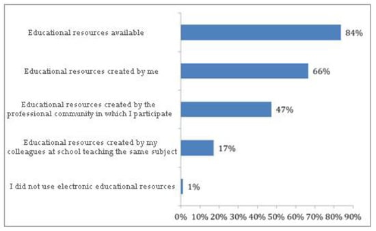 The data show that in 83% of schools all teachers have permanent access to home internet. However, it should be noted that in 3% of schools, there is not a single teacher who has internet at home, and ¾ of these schools are located in the villages (Figure 3). In practice, in almost 6% of schools in the villages, no teacher has access to home internet. In these schools, there are no prerequisites for teaching in an electronic environment from the teacher’s home. This implies limited opportunities for interaction between students and teachers, and creates preconditions for (1) skipping material and lagging behind in learning, (2) accumulation of inefficiencies in the learning process (especially if parents do not have the opportunity to support their child in learning), and (3) increasing educational inequalities. Teachers in most schools have used more than one distance learning platform in an e-learning environment. The most widely used platforms are MS Teams, Google Classroom, School, Zoom, and Moodle. In many schools, the platforms were changed in the process of work. About 8% of schools used only applications (Viber, Messenger) and social networks (Facebook, Instagram). Different schools have used different approaches for choosing platforms. Despite the considerable freedom of choice granted to them, for 48% of the schools, the leading factor in the choice of platforms was the recommendations of the Ministry of Education and Science. Less than half (46%) of schools have taken into account the preferences and capabilities of students, although this should be a leading consideration given the fact that students’ perceptions of the usefulness of a platform and their ability to work with it are key conditions for students’ engagement and active participation in online learning []. The access and use of various educational resources, as well as the creation and use of appropriate didactic materials by teachers, are essential for the effectiveness of distance learning and learning in an electronic environment.