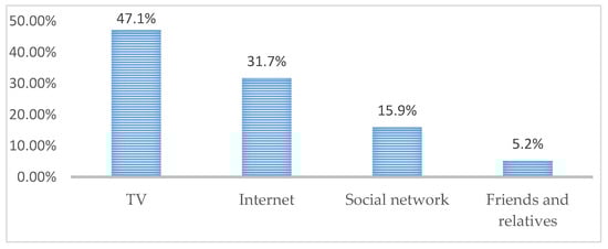 In addition, taking into account the lack of ability to screen true information as an indication of the need for new digital literacy with its inherent critical dimensions. Websites of both international health organizations and world news agencies, as well as their national counterparts, including blogs of many public figures and institutions, have become popular. The abundance of materials—from less to very sensational, from more specialized to widely popular, from authorial to pseudo-authorial, from fully supporting the actions of the headquarters and the government to denying them—accompany the media daily. Television has proved to be a strongly predominant main source of information for people and an on-screen means of recreating images and pictures of existing pandemic realities, regardless of the source (Figure 5).