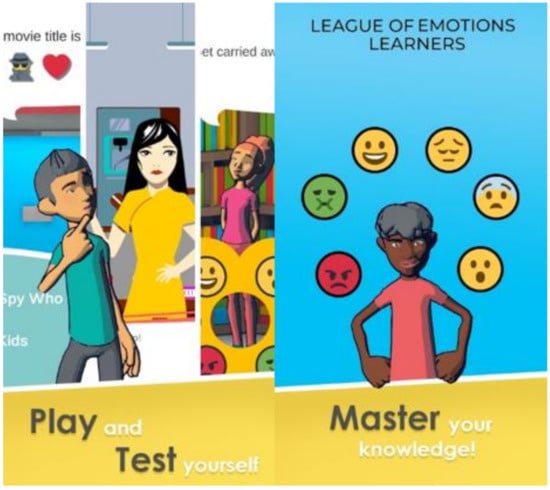 Communication has evolved and changed, and nowadays, digital audiovisual communication has gained extreme relevance. Young people are normally digital natives, that is, they grew up in close contact with computers, the internet, video game consoles, mobile phones, social media, etc. According to different studies, children now receive their first phone at the age of 10 and start interacting in social networks at the age of 14. Additionally, they frequently play with digital devices such as consoles and smartphones. This means they interact with digital audiovisual material from childhood, and this is their preferred way to connect to the world and to express emotions. Therefore, it is important to be aware that, for some people, it is much easier to express emotions using other channels rather than talking. Accordingly, the League of Emotions Learners tool (Figure 1) was conceived as an interactive mobile app (currently available from the Google Play Store—https://play.google.com/store/apps/details?id=com.virtualcampus.loel and Apple AppStore—https://apps.apple.com/app/id1501537657, accessed on 29 July 2021) designed to empower young people to be able to identify, manage, communicate, and understand their own and other people’s emotions.