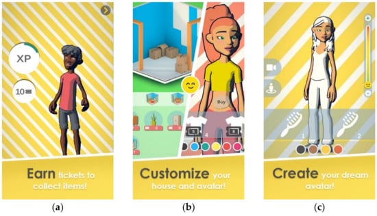 Customization of the avatar (a,c) and home (b) through the ticket system.