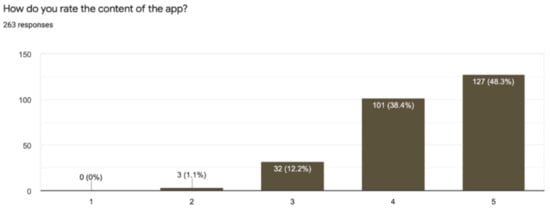 The contents of the app were also rated very highly, as can be seen in Figure 6. Most people (77.9%) thought that the app promoted knowledge and understanding of emotions and that the information provided by the app was relevant to most people’s needs (60.3% of the users). Most people (77.6%) agreed that the app contributed to developing emotional intelligence, although 17% were not so sure about this aspect.