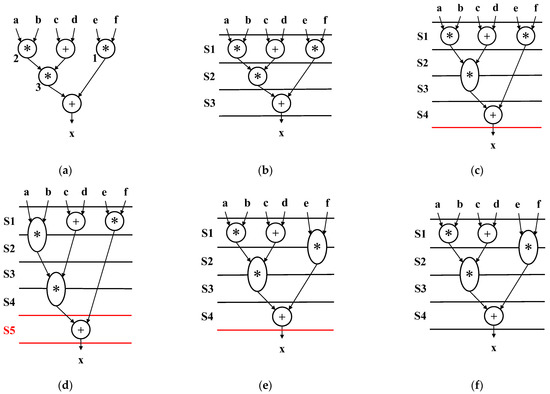 In Figure 1, the three data flow graphs (DFGs) show an example of scheduling. In general, a DFG consists of the nodes and the edges that represent operations and precedence constraints (i.e., data dependencies between the operations), respectively. Each DFG consists of two adders and three multipliers. The notation labeled S means a clock cycle; for instance, S1 is the first clock and S2 is the second clock. In this work, we assume a dual-mode multiplier based on an accuracy-controllable multiplier, which is presented in [12,13]. One mode is used as a normal multiplier that takes two cycles for exact calculation, and the other is an approximate multiplier that takes one cycle. Figure 1a shows that the two multiplications are approximately calculated for each in one cycle, and the whole operation is performed in three cycles. Note that each multiplication in this case takes one cycle, so that the performance is maximized without accounting for accuracy. Therefore, the case in Figure 1a may have a larger error than the case in Figure 1b, where each multiplier performs in two cycles. However, Figure 1b shows four cycles are necessary for all the operations and results in the degradation of performance compared with the case in Figure 1a. Our proposal in Figure 1c is allowed to flexibly employ each multiplier, which is selected as being either exact or approximate. This case demonstrates that one multiplier is approximated, and the others are calculated precisely. The output error should be smaller than the case in Figure 1a. In addition, the total cycle is shown, as well as that in Figure 1b, without the performance degradation. Given the DFG and constraints on the resources and the maximum number of time steps, our proposed scheduling determines each mode of the multipliers and determines an optimal schedule.
