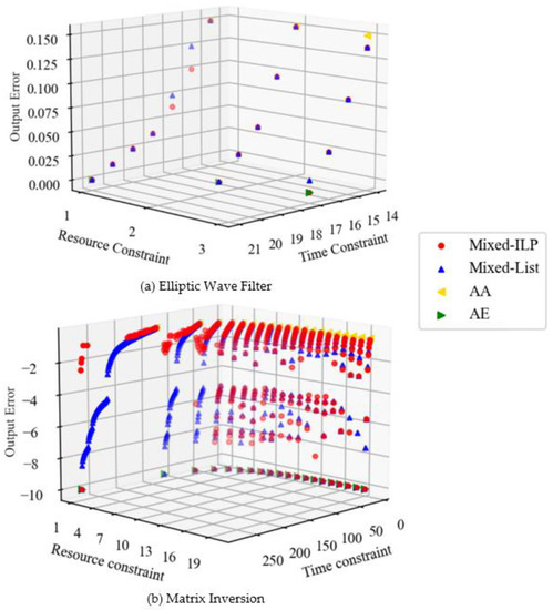 The Elliptic Wave Filter is regular and poses a short critical path of DFG compared to Matrix Inversion. Therefore, when the time constraint is increased and the number of approximate multiplications is reduced, the error of Mixed decreases slowly, as shown in Figure 4a. By comparison, Matrix Inversion is a complex DFG. In such a case, the magnitude of the error differs greatly depending on which multiplication is approximated. In Matrix Inversion, there is a multiplication on the critical path that has a large impact on the output error. Therefore, the distribution of the graph becomes narrower when the resource constraint is increased and the execution time is short. AA and AE in Figure 4 do not take error into account, and there is a trade-off between area and execution time. By comparison, Mixed minimizes the output error due to resource and time constraints, and a trade-off is established between area, execution time, and output error.