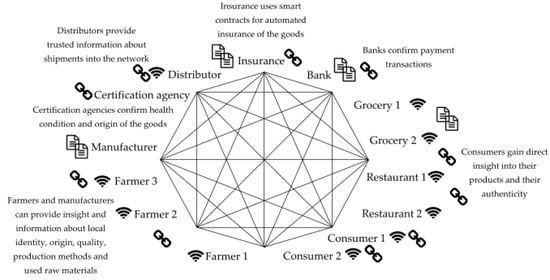 The local food value chain starts with the players, inputs, or products and handles their flow to the final customers. Efficiency can be improved if products flow faster, safer, transparently, immutably, and trustily through the value chain. Handling food is a challenge, especially locally produced food. It is related to unique features such as the seasonal character, whether it is handcrafted, and lead times. Additionally, food represents a material sensitive to the influences of the external and internal environment and limited durability influencing the quality. The employment of blockchain technology as a governing solution creates a new business model with a collaborative approach of all the players who become an integral part of an ecosystem of shared risk. LFSC can be designed as consumer-to-business (C2B), business-to-consumer (B2C), and business-to-business (B2B) models, meaning that individual farmers (producers) or businesses can be enabled to offer their products in the value chain. The target customers or end-users of the model may be retailers, individual customers, caterers, and the tourist sector. The other players represent logistic services and support institutions such as governmental agencies for veterinary, sanitary control, banks, local community, and consultants’ agencies. Blockchain in the LFSC delivers a new environment for sharing data where competitors can cooperate. Blockchain will enable the participants to identify any bottlenecks and problems by sharing the information between the participants. It helps regarding effective asset utilization; optimized facilities location and warehouse activities; and efficient storage, picking, and packing activities.