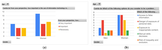 The objective of the surveys is to obtain data to determine the factors that affect learning when ICT are used as educational tools. For this purpose, several questions have been generated that are aligned with variables that can be analyzed and are the product of the review of similar works where the different needs of students have been identified. The reviewed works establish that to guarantee the veracity of the answers, the surveys must be objective and must comply with certain guidelines that prevent the respondent from losing motivation in the development of the survey. Therefore, a test-type survey is considered adequate when it contains fewer than 20 questions [24]. In this work, 13 general questions have been considered and their results can be analyzed to define which of the variables has the greatest influence on the explanation of the phenomenon studied [25,26].