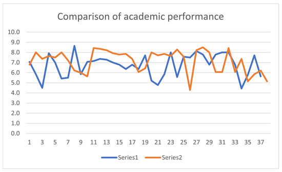 In Figure 4, the comparison of results is presented based on the averages of each parallel during the first progress given for seven weeks where 14 activities are developed. The orange trend line represents the trend of parallel “A” (ICT use), and the blue color corresponds to parallel “B”. As the main results, it is observed that the trend line in parallel “A” is more harmonious in most weeks, even when, in the activities of weeks 6 and 7, the ratings tend to go down; however, this is something that happens in both groups, and may be because each activity has an increasing value about the difficulty in its development because they are activities that require a cumulative knowledge of the subject. In addition, the two trend lines follow a certain relationship in some weeks, that is, there are topics in which the two groups present an increase in their ratings and a decrease in others. However, we must consider that the grade point average is always better in the use of ICT.