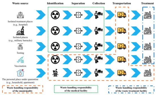 In this section, we will analyze the waste treatment process during the COVID-19 pandemic in Vietnam, thereby analyzing and evaluating the conversion of medical equipment and supplies into hazardous medical waste. This information is derived from documents compiled by centralized quarantine procedures (Decision 878), household quarantine (Decision 879), medical quarantine (Decision 1551) and regional quarantine custody areas (Decision 904). In addition, we use the National Steering Committee’s documents in the prevention of the COVID-19 epidemic on the mandatory isolation period (5 May 2021; Official letter 600/CD-BCD). We then analyze the possible limitations of the medical waste treatment process in the prevention of the COVID-19 epidemic in Vietnam. Finally, a proposed solution and model section will be presented.