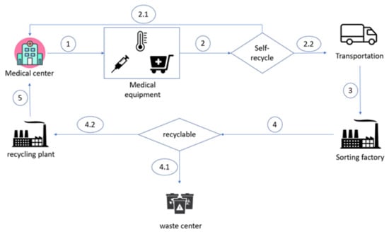 First, when the device is transported to the hospital/medical center, the system initiates and stores data. Equipment and supplies are classified at the time of usage in the second step. Specifically, the sub-step (i.e., 2.1) presents the equipment and supplies that can be reused at the medical facility and stored, whereas one-time use equipment and supplies are collected and disposed of (i.e., 2.2). In the third step, the medical waste is transported to the factory for sorting. After that, the segmentation is carried out in step 4, wherein the recyclable equipment is transported to the disposal and recycling sites (4.2), and the remaining medical supplies are transported to the disposal area (4.1).