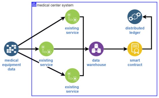 Figure 3 depicts the data initialization process for medical devices. When medical equipment is transported to the medical center, equipment data are extracted through existing services. After processing and extracting data, these services proceed to store data of the equipment at the data warehouse of the management system. Then, all data at the data warehouse transfers to the blockchain system for storage. In this step, the APIs of the smart contract receive the data and store them in the distributed ledger of the blockchain system in the form of transactions. In general, medical equipment data consist of the following fields: