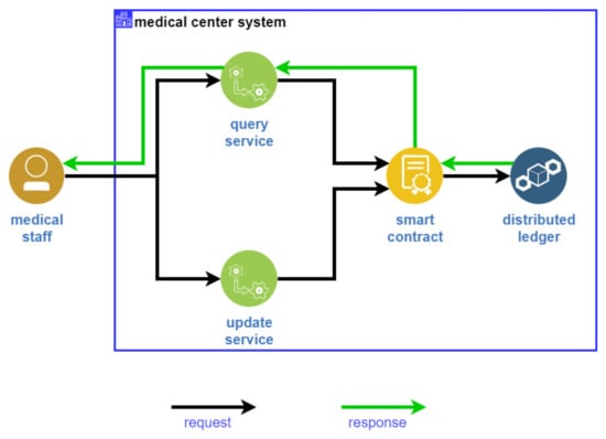 Figure 4 depicts the process of querying the data of equipment and supplies in a medical facility. The processing flow begins when the hospital or medical facility staff requests to query the data of any equipment or supply. The request is sent to the services of the management system, where the system determines the ID of the requested accouterments, then sends this ID to the APIs of the smart contract. The smart contract APIs send a request to the distributed ledger to query the item’s data with the corresponding ID, then check the existence of the data to determine if the data are valid and complete. Smart contract query APIs send data to the query service, and the information is then returned to the user. In case the data in the smart contract are invalid or incomplete, the smart contract APIs return a “data broken” error message for the query service. This error message is sent to the user at the end of the flow. Furthermore, the smart contract also signals that the data do not exist if the data corresponding to the ID cannot be found in the distributed ledger.