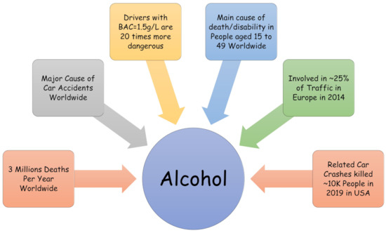 In addition, alcohol consumption can lead to driver impairment, which is a major cause of car accidents around the world [3]. Indeed, drinking alcohol before (or even while) driving decreases several of the driver’s functional abilities, including tracking power, vision, concentration, reaction time, and proper speed control, all of which increase the risk of a crash [4]. According to [5], drivers with a blood alcohol concentration (BAC) of 1.5 g/L are judged to be 20 times more dangerous than sober drivers.