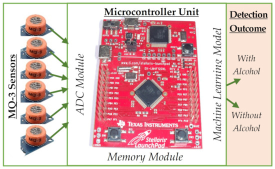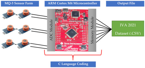 This module was placed inside the vehicle and comprised six MQ-3 sensors and a memory unit connected via ARM Cortex M4 Microcontroller [43]. MQ-3 gas sensor has a high sensitivity to alcohol with good resistance to disturbance of gasoline, smoke, and vapor [44]. This sensor provides an analog resistive output based on alcohol concentration, and thus it was connected to ARM Cortex M4 Microcontroller via ADC (analog-to-digital convertor) unit. The memory unit is important for keeping track of the readings calibrated through the six sensors to provide more comprehensive and accurate detectability of in-vehicle alcohol levels. The readings were captured through the ARM Cortex M4 Microcontroller using a small C language program written for the microcontroller to collect the readings of the six sensors. The hardware part of this model is illustrated in Figure 3. After several experiments, a large number of samples were collected and stored as a CSV file that contains 14,400 samples for the in-vehicle alcohol level experiments. These samples were distributed equally as 7200 samples for in-vehicle with alcohol and 7200 samples for in-vehicle without alcohol, and finally deployed in a balanced dataset (IVA 2021) [45] to be used for further investigation and modeling.