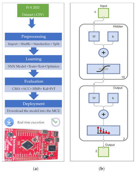 This module was developed, coded, and uploaded to the microcontroller unit. The in-vehicle alcohol detection problem was modeled as a supervised machine learning problem developed as a classification system using shallow neural networks (SNN) [46] with their corresponding modules and algorithms (Table 2). The complete framework for this system is illustrated in Figure 4. Initially, the collected dataset from the hardware module was preprocessed before being fed into the learning operations.