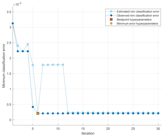 Model optimization for optimizable neural network model using the hyperparameter search range. The plot investigates the trajectory of estimated minimum classification error, and the observed minimum classification error with respect to varying numbers of iterations (max = 30 iterations). In this figure, the best point hyperparameters that satisfies the minimum error hyperparameters are also traced.