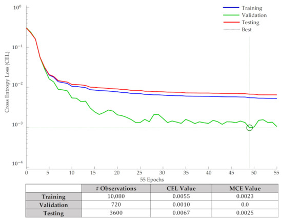At this point and henceforth, the discussion will focus on the O-SNN model illustrated in Figure 4b, as it was selected as the best neural network architecture to model our problem statement of in-vehicle alcohol detection with a high-performance and least delay. For instance, Figure 8 traces the performance trajectories of the O-SNN in terms of the cross-entropy loss (CEL) function [56] for 55 epochs of the learning process, including training, validation, and testing trajectories. The target value of CEL is to reach the zero value; however, the best validation performance was recorded after epoch 49, with CEL = 1.0 ×. Along with the figure, the table attached to the figure summarizes the error values obtained for the training, validation, and testing dataset in terms of cross-entropy loss (CEL) and the minimum classification error (MCE). The table reveals the robustness of this model, scoring low error rates for all subsets of the dataset (the training, validation, and testing).