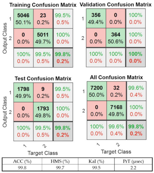 To obtain more perceptions of the proposed model and the solution approach, Figure 9 demonstrates the two-class confusion matrix analysis of the O-SNN model for the training dataset, validation dataset, testing dataset, and the overall dataset. In addition, along with the figure, a summary of performance indicators (ACC, HMS, KaI, and PrT) is provided. The employed datasets were balanced, comprising a total of 14,400 samples distributed equally between the positive and the negative classes (7200 samples per class). As can be clearly observed from the figure, overall, the model exhibits a high capability in discriminating positive classes and negative classes, having TP = 7200, FP = 32, FN = 0, and TN = 7168. Accordingly, the overall performance metrics reveal that the system is highly sensitive (sensitivity = 99.6%), highly specific (specificity = 100%), highly accurate (accuracy = 99.8%), and highly precise (precision = 100%). Accordingly, the performance indication metrics for accuracy, harmonic means, kappa index, and prediction delay are summarized in Table 4. In short, the proposed in-vehicle alcohol detection-based O-SNN model is precise, accurate, and lightweight, and can provide an inferencing outcome of less than 2.5 s, and a classification error of less than at least 2.5%.