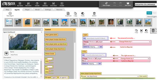 Therefore, drawing from past experience, two of the AR games were built using Taleblazer http://taleblazer.org/, accessed on 1 September 2023), an open platform for developing location-based AR games for outdoor and interior spaces. Taleblazer is a product of the Massachusetts Institute of Technology (MIT). Taleblazer has a visual block-based programming environment similar to Scratch, a well-known product of MIT for introducing young children and novices to the basics of algorithmic thinking and programming. Furthermore, Taleblazer produces AR games that are available on both Android and IOS mobile devices.