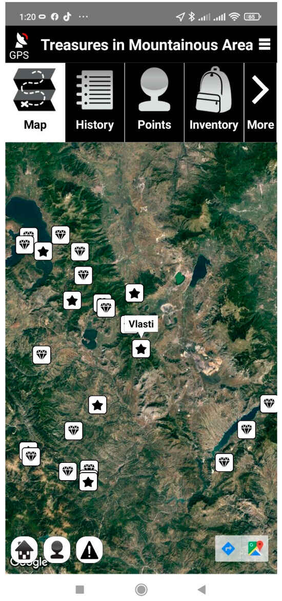 In the scenario of the game “Treasures in the mountainous areas of Western Macedonia”, the users are presented with interesting destinations that can be visited during their stay in the area. On the Taleblazer map, these destinations are depicted with stars and diamond icons (Figure 3). The most significant places are depicted as stars. The visitor is prompted to visit at least four places, two of which would have to be “stars”, in order to receive prizes. Points are also gathered during the visits.