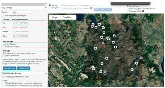 The basic elements of the Taleblazer programming environment are “Regions” and “Agents”. Regions are the physical areas on the map where the game (or tour) will evolve. Using a selection tool, the designer can determine the game’s region on a digital map. After the region is set, “Agents” can be introduced (Figure 4). Agents are multimedia elements associated with GPS locations and are activated when a learner “bumps” into these locations (Figure 4). This multimedia content can be in the form of images, multiple-choice questions, sounds, narration, and video.