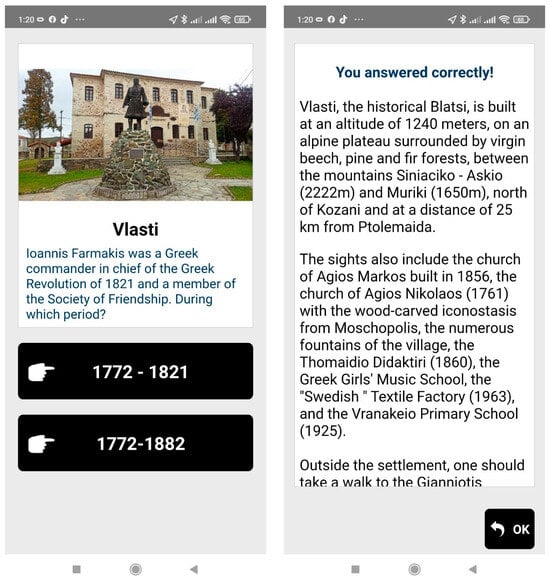 When the user reaches a point of interest (that is, when the blue dot of the user gets close to a star or diamond icon), informative multimedia content in the form of text and images is activated. This content appears on the screen of the mobile device, and the users are also often prompted to observe their surroundings (e.g., a bridge, church, etc.) to answer a multiple-choice question. Feedback is then given to the users by telling them if the answer is correct and by giving them more detailed information regarding the question topic (Figure 5). If the answer is correct, then a point is also given as a reward.