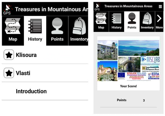 The visited places can be viewed at any time in the History tab, and the points gathered in the Points b. tab. Virtual objects (stars and diamonds) are collected in the Inventory tab (Figure 6).