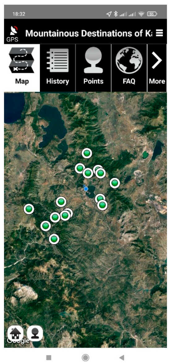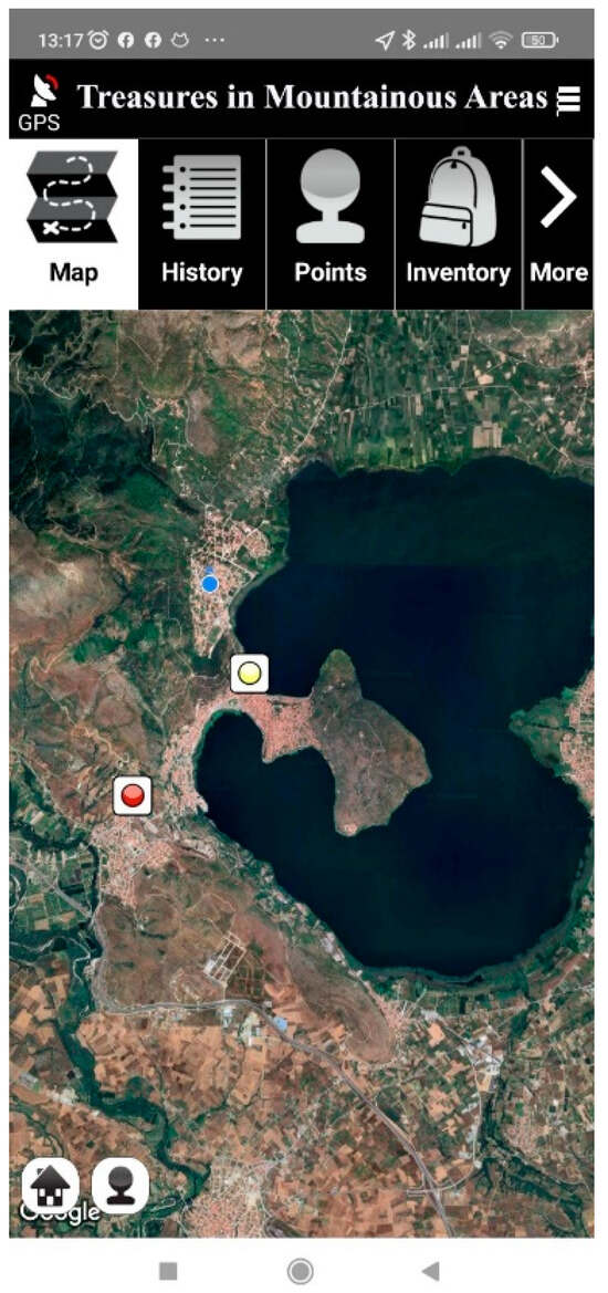 The second AR game “Mountainous Destinations of Kastoria” is similar to the first one. In this game, the users are prompted to visit interesting places in the Prefecture of Kastoria, which is part of Western Macedonia. Again, four places would have to be visited in order to receive prizes. The places were equally important this time, so there were no stars or diamonds (Figure 7).