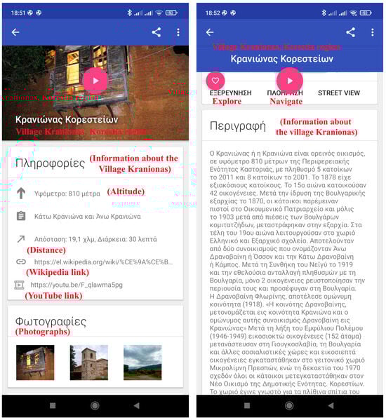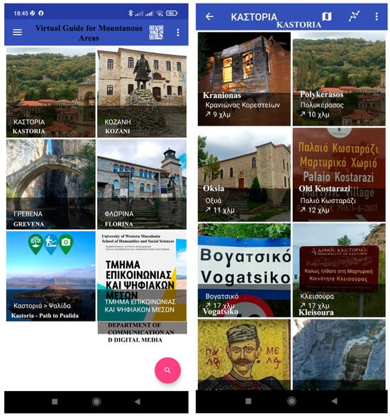 Using this application, the users can be guided with Google Map API to visit places in the four regional units of Western Macedonia, Kozani, Kastoria, Florina, and Grevena. When starting the application, the first screen is a menu with image buttons for the four regional units plus an image button for the Department of Communication and Digital Media. By pressing any of the buttons, the user is forwarded to another menu with image buttons of the most known locations in each regional unit that are situated in mountainous areas (Figure 9). The snapshot images of the application in Figure 9 were edited to include English labels. The locations are mainly villages and places of historical and cultural heritage interest. It is also worth saying that this application contains some interesting mountainous paths. Tourists of the area can use the applications as a guide to walk these paths.