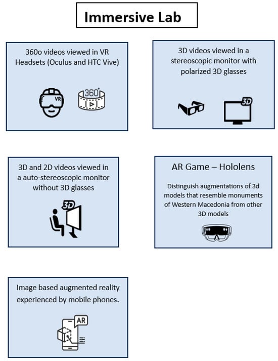 A mixed reality lab was also established for the purposes of the project consisting of VR, AR, and stereoscopic devices, as well as content to be viewed with these devices. The lab was equipped with 3D stereoscopic monitors, and VR and AR headsets. More specifically, the lab consists of one 3D TV where content can be viewed through 3D polarized glasses, an auto stereoscopic monitor for viewing 3D content without glasses, and plain 2D videos, two VR headsets, and an AR headset. To produce content for these devices, a 3D camera and a 3D 360° VR camera were used. Three-dimensional models were also built for the AR headset using an open source 3D computer graphics software tool.