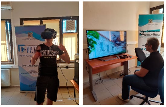 The contribution of this study to the existing literature is the presentation of a holistic approach that utilizes a range of AR and VR technologies in combination for touristic promotion and education. These technologies include augmented reality location-based games, an AR mobile application with virtual guides that combines location-based and image-based AR, and an immersive lab with content that can be viewed using virtual and augmented reality headsets as well as content that can be viewed through stereoscopic monitors. The equipment for producing the content for these devices is also presented. It is worth mentioning that most of the research initiatives encountered in the literature focus on specific applications that are either VR or AR rather than several AR and VR technologies that are used in combination. This is evident from literature reviews [,] that examine both VR and AR applications in tourism. For example, in the critical review by Wei [] amongst the 60 papers that were retrieved and reviewed, 33 concerned VR, 25 AR, and only 2 combined both technologies.