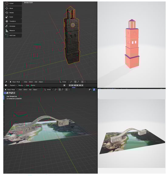 Jiang et al. [] examined the efficacy of AR for enhancing the memorability of tourism experiences (MTE) at the heritage site of the Great Wall of China, using a smartphone app, equipped with four interrelated AR heritage tourism experiences. In [], an AR location-based application that added a layer of 3D models of historical buildings in the real world was created. The 3D models presented how these constructions were in their past state. The authors of [] developed an AR game called “The buildings speak about our city”, which is a combination of location-based and marker-based augmented reality. The game aims to motivate primary school students to discover the buildings of tobacco warehouses in a city in western Greece, which have historical, architectural, and cultural value, and explore their relationship with the city’s economic and cultural development.