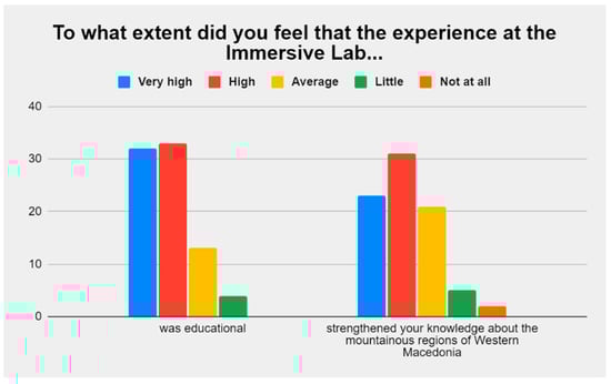 Regarding the evaluation of the immersive lab experience, certain elements received high rankings, such as user satisfaction, immersion in the experience, intention to revisit the lab, and intention to recommend the experience to others. Furthermore, the experience influenced the users’ interest to visit new places in the mountainous regions of Western Macedonia. The visitors perceived the experience as educational, and a significant percentage of these visitors feel that they gained knowledge regarding the destinations of Western Macedonia. The further analysis showed that entertainment and educational utility were factors that are positively related to the intentions of the survey participants to visit destinations of Western Macedonia. This is also in line with findings from previous research efforts. Although some early conceptual studies warned that VR will eventually threaten physical and corporeal travel [], it was later proven through many studies that the engagement and involvement participants felt when interacting with VR led to increased positive feelings toward the destination (e.g., [,,,]). In a study conducted by Pantano and Servidio [], participants who had a VR experience of a touristic destination expressed a desire to travel to the real tourism site in order to compare it to the one reconstructed in VR.