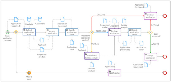 At the flow start, we collect the application data and applicant data in the Application and Applicant entities, respectively. Then, the Proceed with application review? gateway uses the Application status attribute derived from Table 1 to redirect the flow to the Decline application task if the status is red (decline), to the Preliminary bureau analysis task if the status is yellow (bureau) or directly to the review application task if the status is blue (through). After the review, the updated status is finally used in the Load accepted? gateway to decide for the decline (red) or accept (green) application task.
