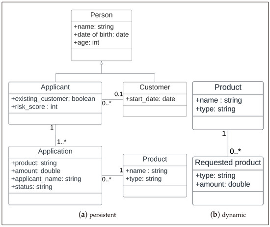 Other Data Objects involved in the BPMN model, i.e., Requested product (generated by the Collect applicant data task) and Application color, are clearly internal to the process and exists only during its execution. We call them dynamic entities. For the sake of simplicity, we include a formalization of such entities in the class diagram, as in Figure 5b, although they are not present in the system implementation. Anyway, in general we make no hard assumptions on the availability of such class diagrams for dynamic entities.