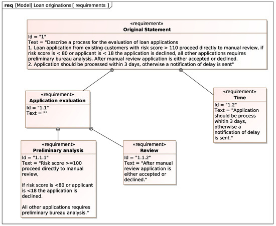 The two requirements considered for the loan application example can be modeled with the Requirement Diagram shown in Figure 7. The diagram defines a compound requirement named Original Statement that contains all the requirements the process must satisfy. These requirements contain the atomic requirement Time and the compound requirement Application evaluation, which in turn contains Preliminary analysis and Review. As we will show, this requirement hierarchy helps to visualize the traceability from the requirements to the system model elements depending on them.