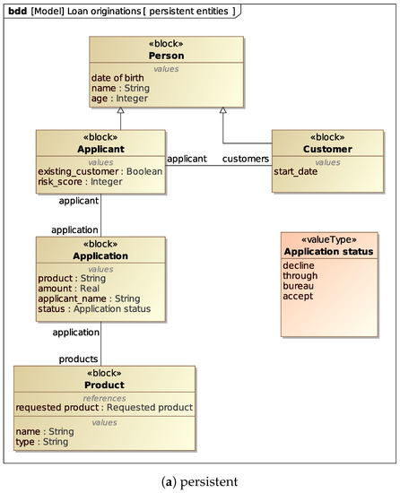 SysML Block Definition Diagram for the loan application persistent and dynamic entities.