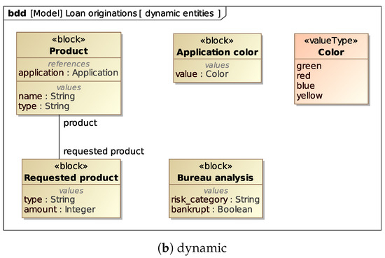 The UML class diagram introduced in Section 5.2 (Figure 5) to formalize the process data corresponding to persistent and dynamic entities can be turned into a Block Definition Diagram without any loss of information, as is shown in Figure 8a,b, where we use Value Types to model the possible values that data items in the process can take.