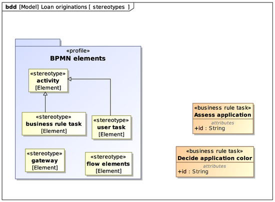 - Activity represents BPMN activities. In particular, Business Rule Tasks and User Tasks. We use an attribute named id to store in the SysML models the ID of the corresponding element in the BPMN model.