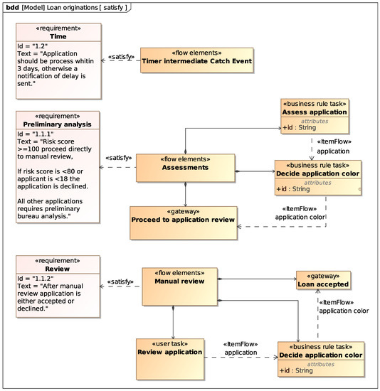 In order to properly manage requirements, once they have been defined, it is important to have the ability to describe and follow their use at development and maintenance time, in both a forward and backward direction. This ability is named requirement traceability and has an important role in Model-Based Systems Engineering (MBSE). Several works in the field of systems engineering achieve requirements traceability by using the MBSE and SysML (see, e.g., [15,16]). In [17], the authors present a traceability approach that supports decision-making requirements by combining the SysML with the BPMN and DMN. The SysML is used to model some aspects of system, and processes and decision-making activities are defined in terms of the BPMN and DMN standards, respectively. Such a result provides a useful input to properly integrate the behavioral view of the BPMN model with the structural view of the SysML model through the DMN and SDMN models.