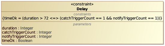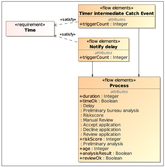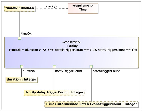 As an example, an informal equation for the Time constraint in Figure 7 could be the one shown in the constraint block Delay shown in Figure 11. Here, is the execution time in hours for the whole process, is the number of times the After 3 days Intermediate Timer Catch Event is triggered and is the number of times the Send Task Notify delay is run. The right side of the equation states that the event is triggered and the task is run if and only if the process lasts for more than 72 h (i.e., 3 days). The variable computed by the equation tells us whether the Time requirement is satisfied or not. Figure 12 shows a revised version of the blocks for the process elements, with the addition of new blocks and properties that model process parameters related to the constraint equation variables.