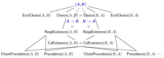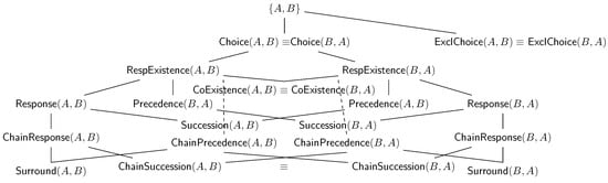 Declarative clauses, therefore, involve the instantiation of declarative templates with activation and target conditions; by restricting our consideration to dataless specifications, such conditions restrict the possible activity label events by the one expressed by the activation (and target) conditions (and ). For example, has A as an activation condition, as an occurrence of the first A requires checking whether no preceding B shall occur. We denote as the set of traces containing at least one event satisfying an activation condition in c []. The clause activation might require the investigation of a possible target condition, where temporal occurrence is regulated by the template semantics. To demonstrate this, consider the following example: while requires that the target conditions always follow the activations, only requires its existence across the trace, and holds no temporal constraints as the former. Some of the clauses listed in Table 1 entail others, due to the stricter variation in the “temporal strictness” or the composition of multiple clauses. The previous example focuses on stricter temporal variation, while entails both and .